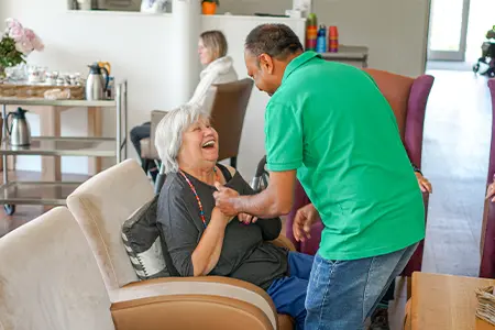 Bewoner en medewerker lachen om een grapje