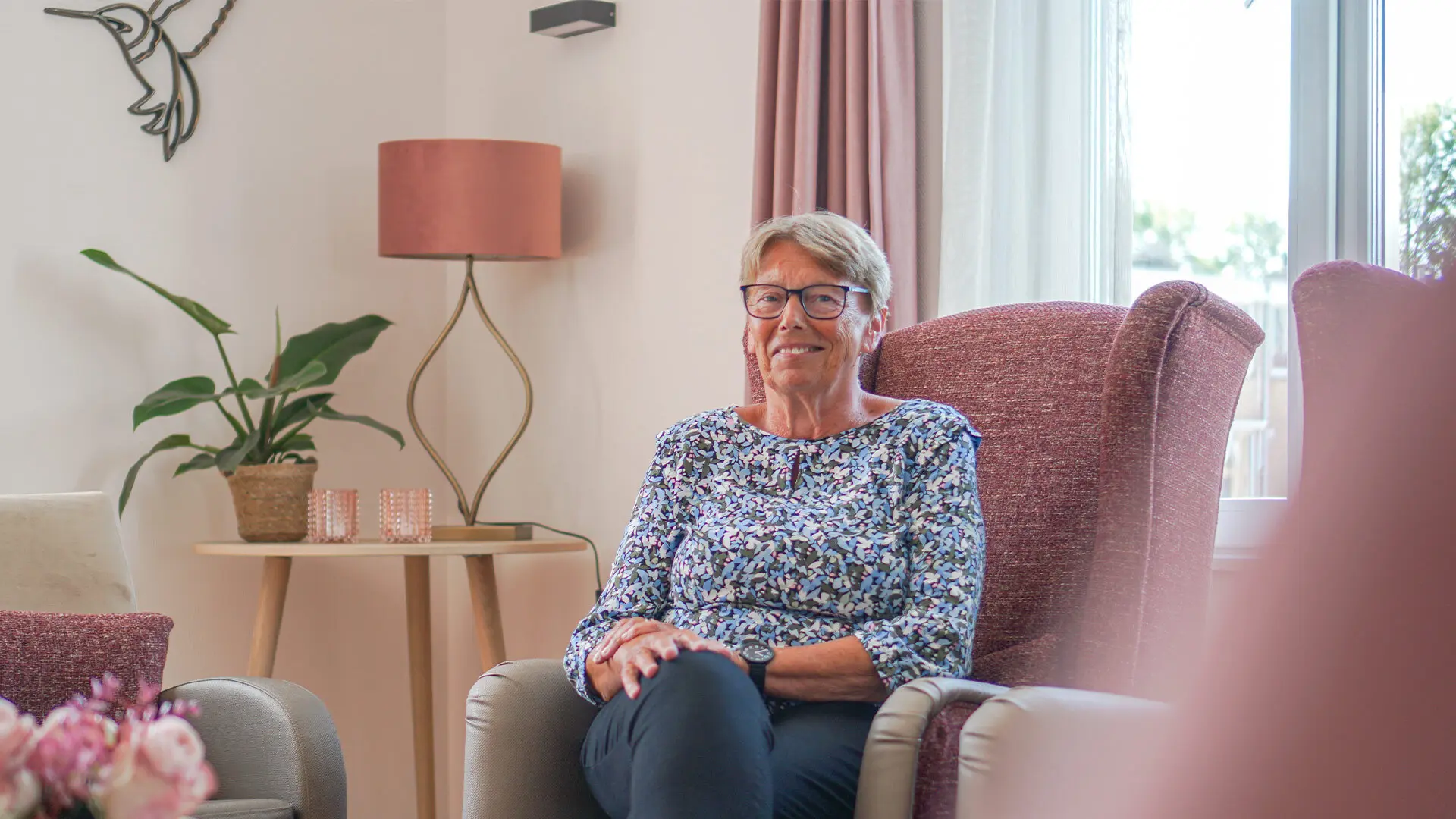 Maar ze heeft ook veel plezier. “Gisteravond nog, was er een bootcamp voor de medewerkers, wij hebben gekeken. Ik heb in een deuk gelegen. Maar ze zijn allemaal gezellig ook hoor. Ik heb er nog niet één gezien die ik níet leuk vind. We kunnen samen heel veel lachen, een praatje maken. Alles mag, alles kan hier. En dat is voor mij heel belangrijk. Vrijheid. En rust, ik hoef niet meer over de rekeningen en het huishouden na te denken. Hoewel ik wel graag help. Ik zet elke ochtend om half 9 de wekker, om de tafel te dekken voor het ontbijt. Maar iedereen ontbijt wanneer hij of zij wil, hoor. Zelf vind ik het wel fijn om een beetje structuur te hebben. Dat geeft ook rust. Ja, laat het maar zo blijven: rust, het zonnetje erbij, dan ben ik gelukkig. Ik ga hier in mijn kistje weg.”